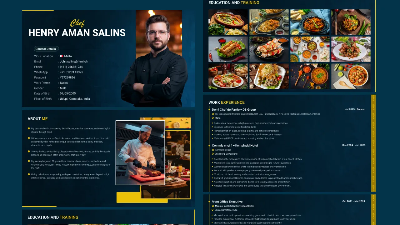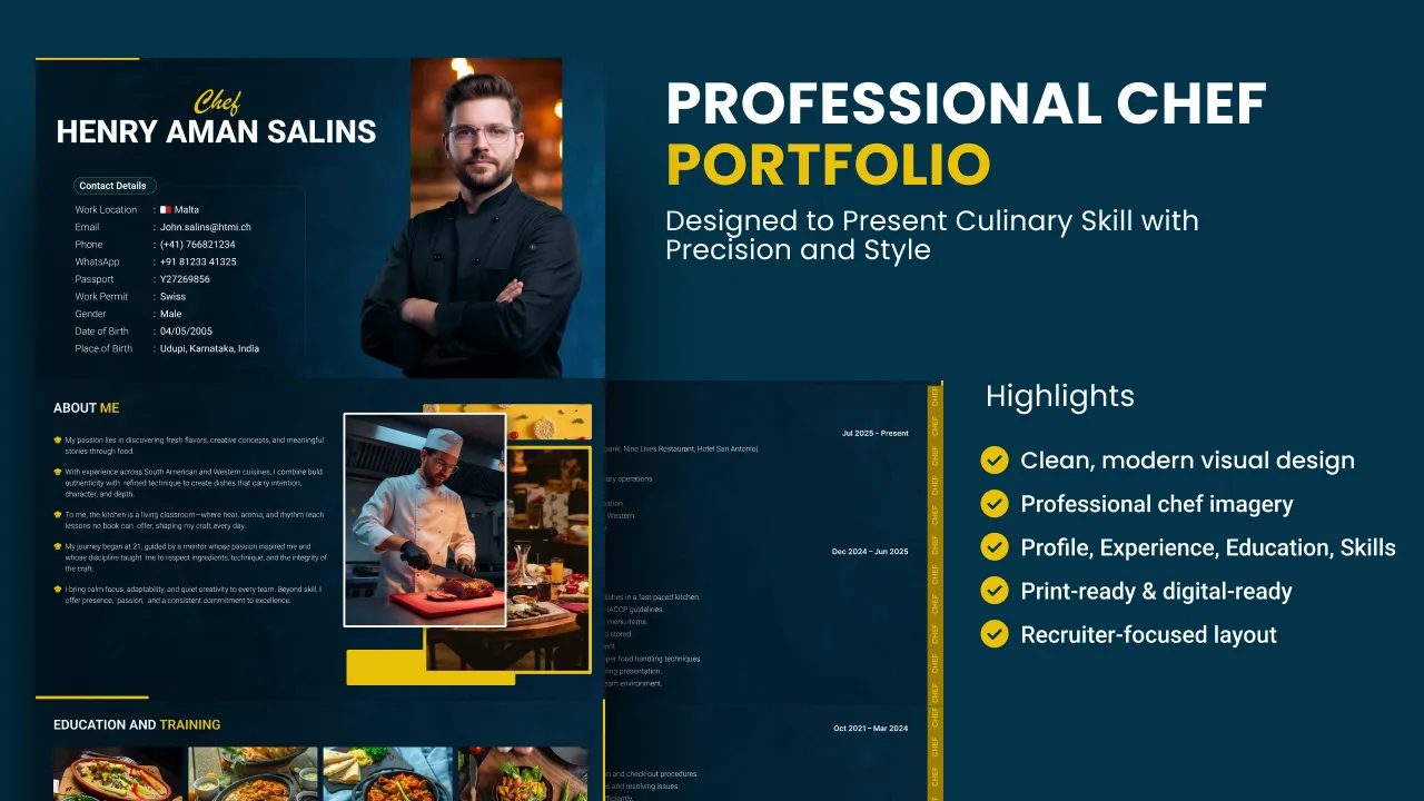 This private chef portfolio is suitable for job applications, hotel placements, restaurant roles, and personal branding.